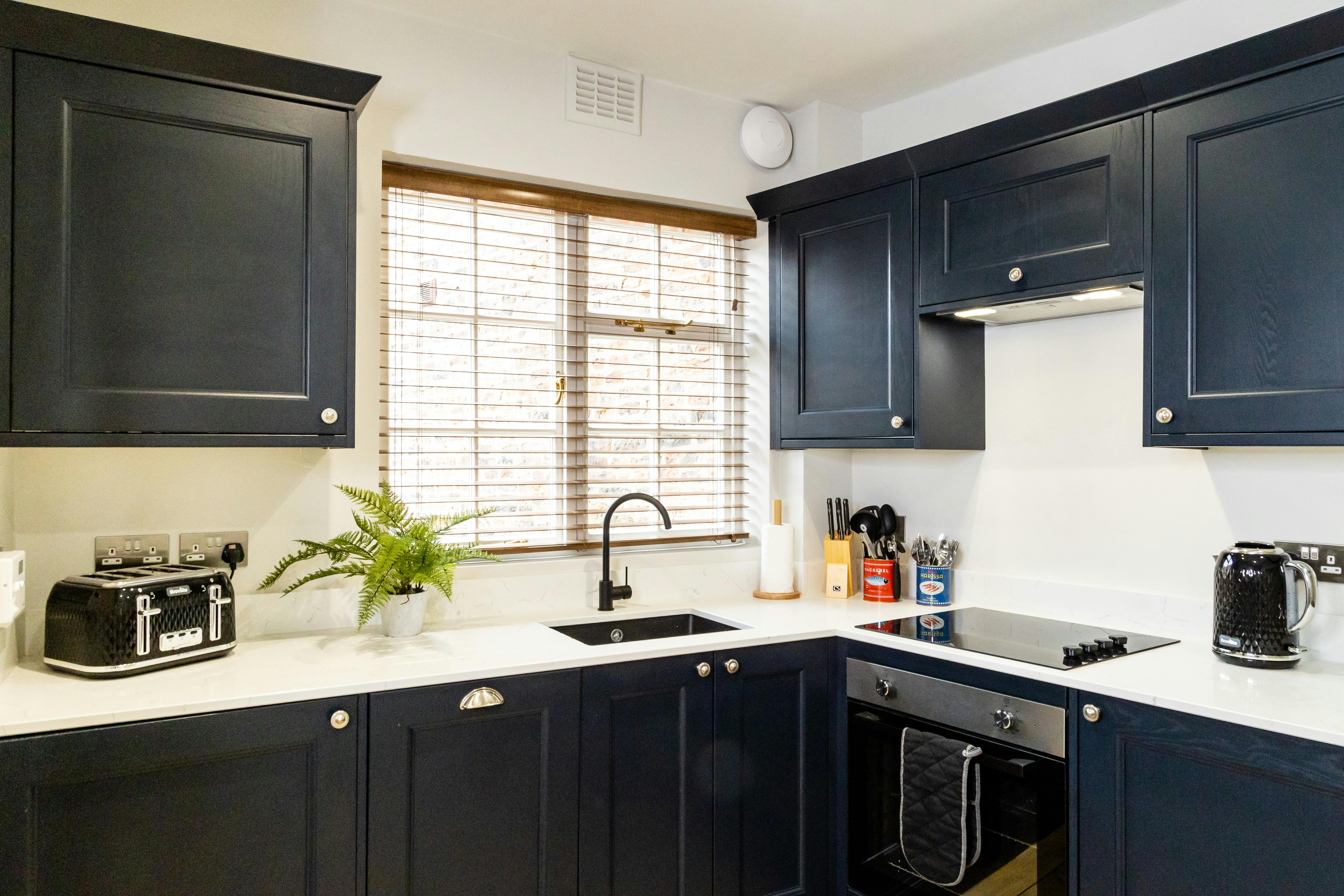 The kitchen boasts a modern counter sunk hob , oven, toaster, kettle, and microwave. There is a table and four chairs to enjoy dinner from this modern space.