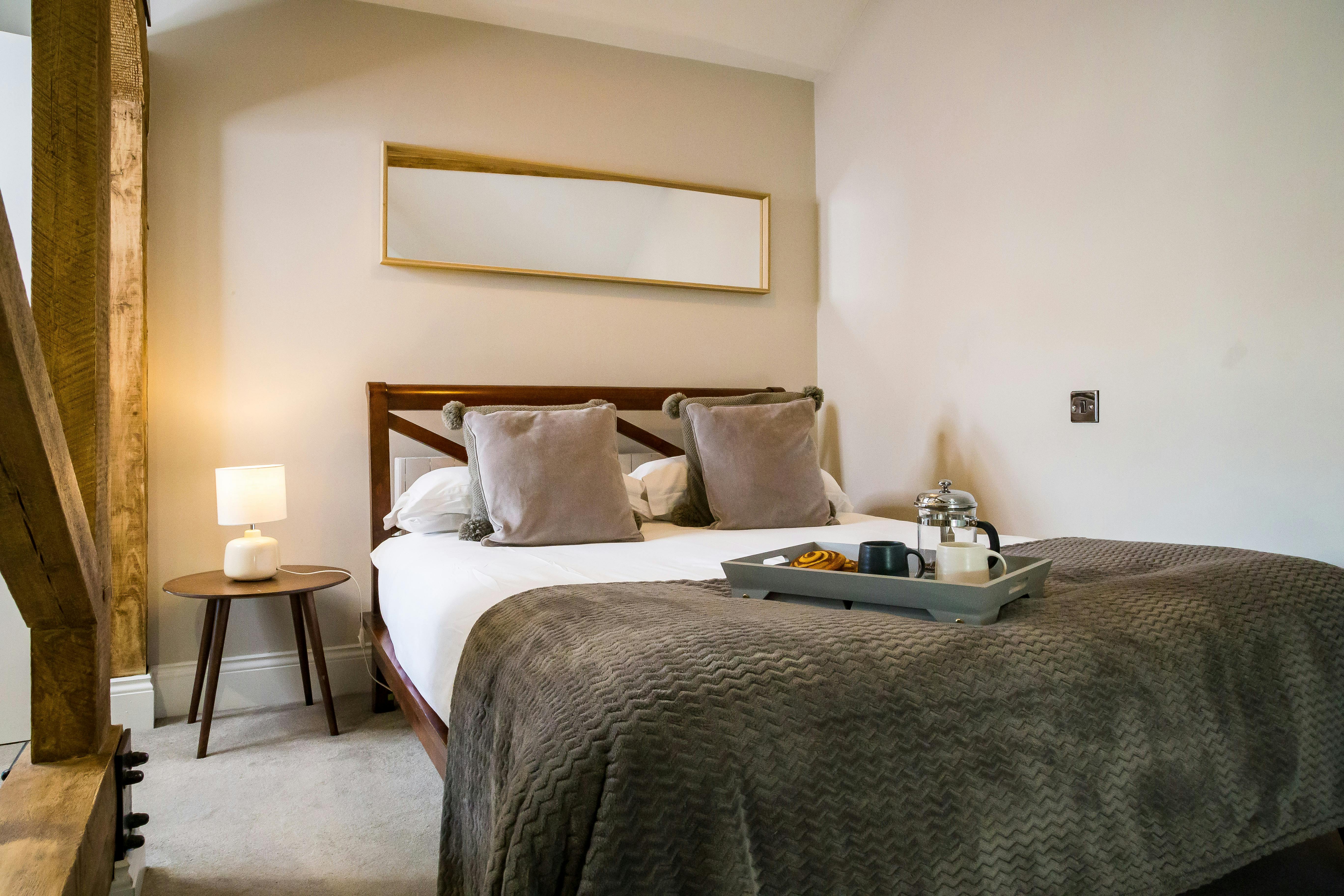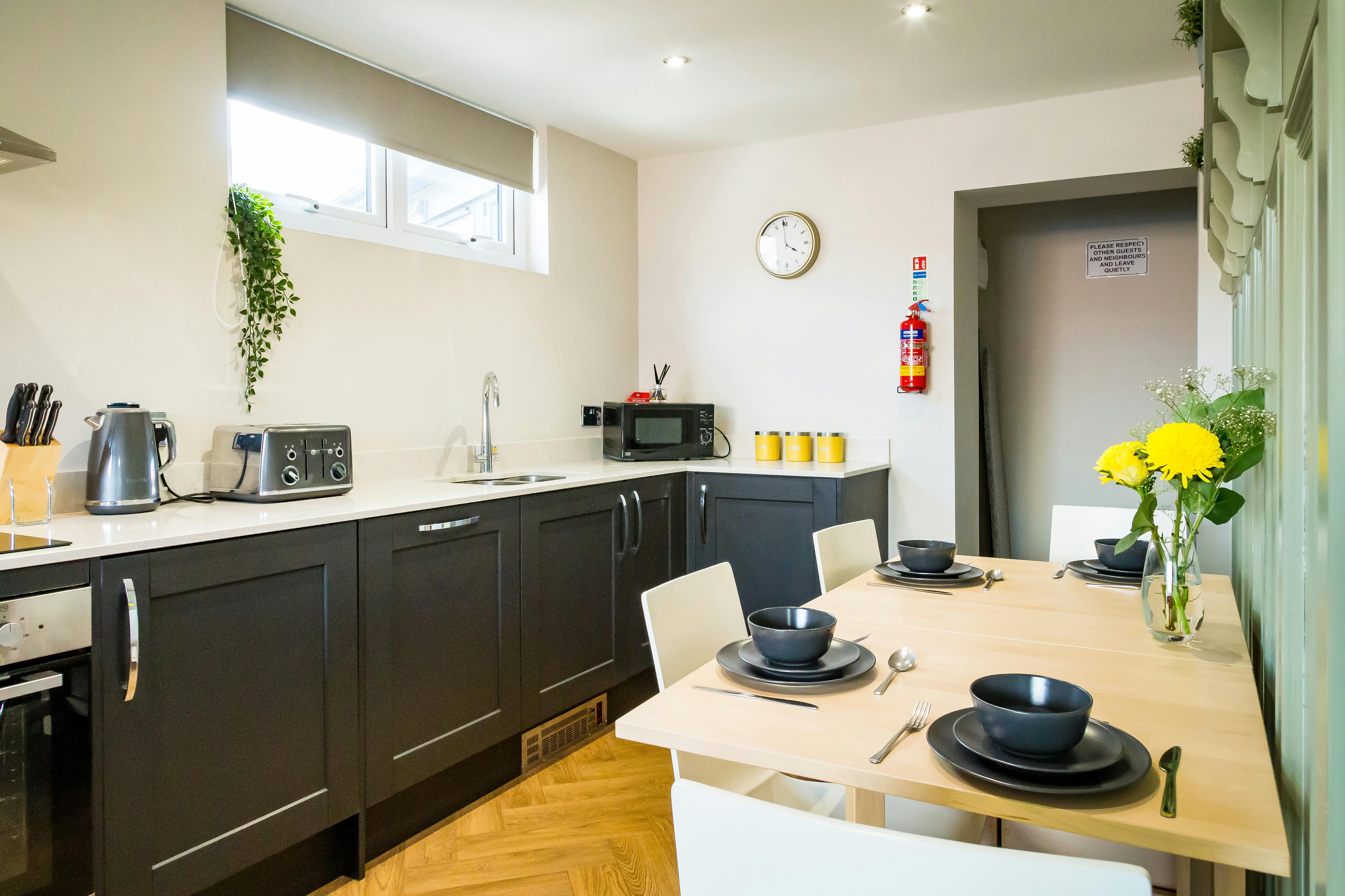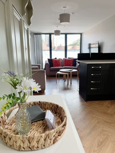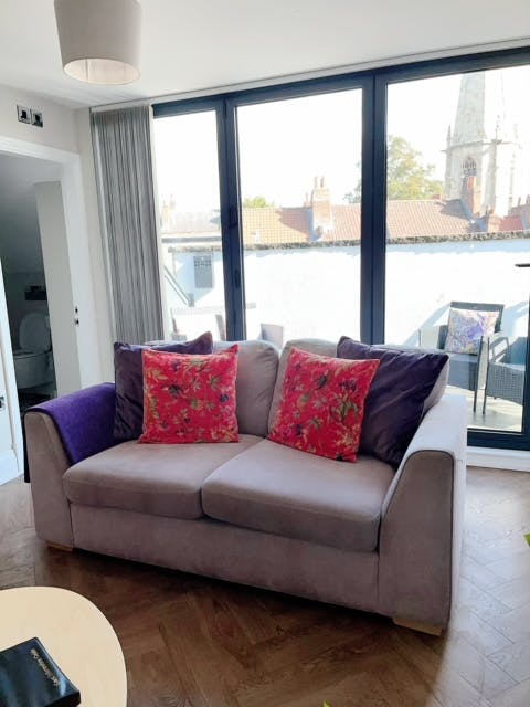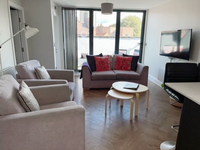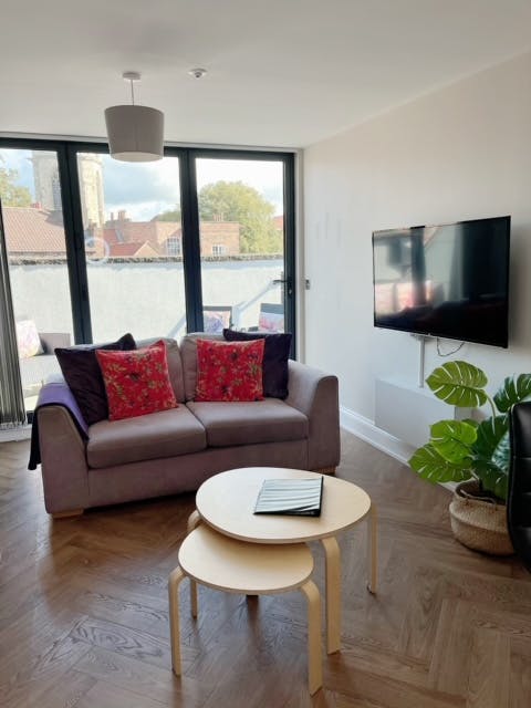 This stylish apartment has original wooden beams, modern furnishings, a well-equipped kitchen and large bifold doors leading to an outdoor patio area with views over the rooftops of York and St Mary's Church.